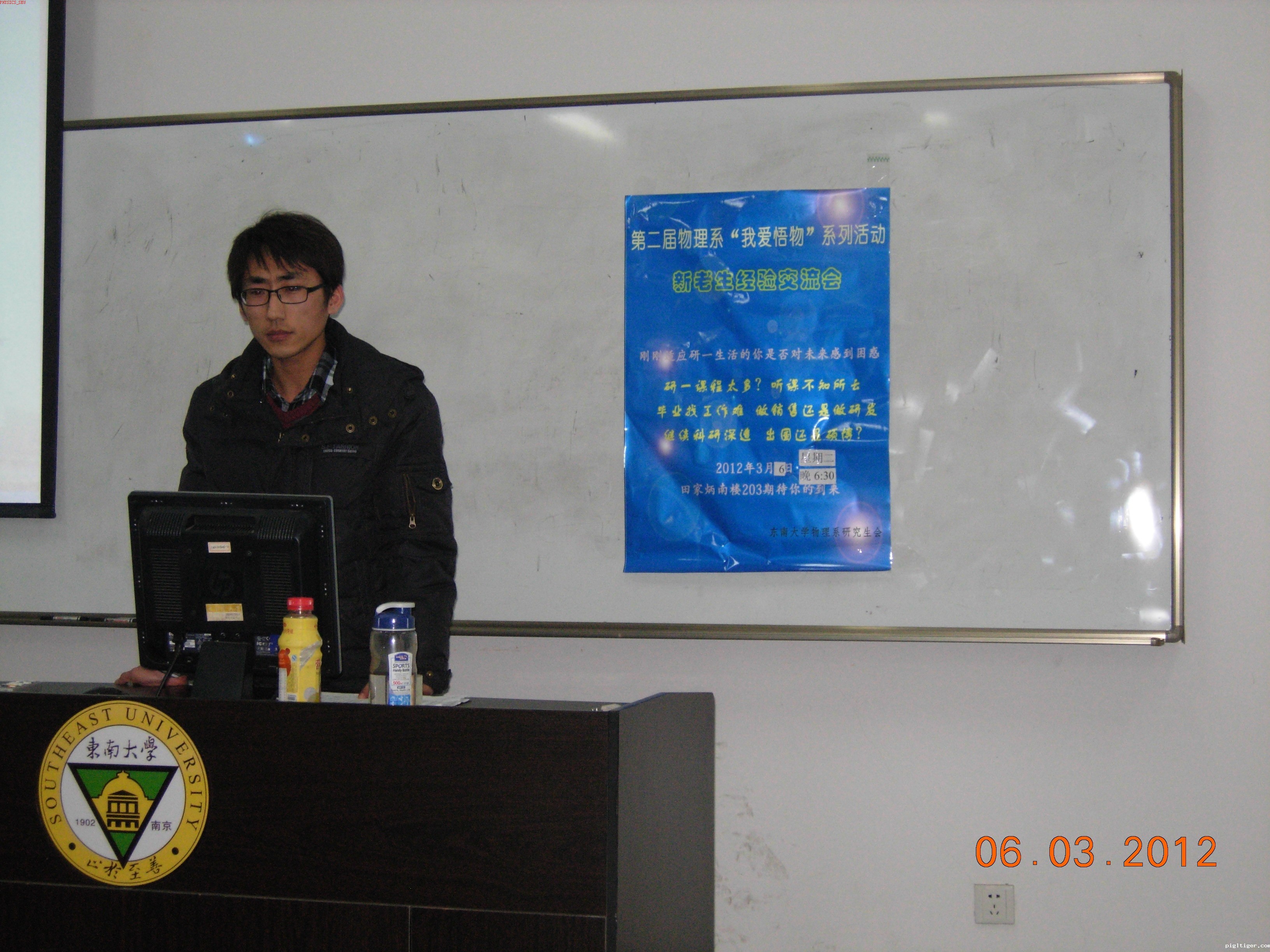 2012年3月6日,在系团委和系研究生会的组织下,第二届物理系“我爱吾物”系列活动之新老生交流会在田家炳楼南楼203成功举办。本次活动邀请了多位2012届硕士毕业生,请他们介绍毕业之后的人生规划,比如工作,读博,出国等问题,旨在向研一新生传授在学习生活过程中的经验和心得。