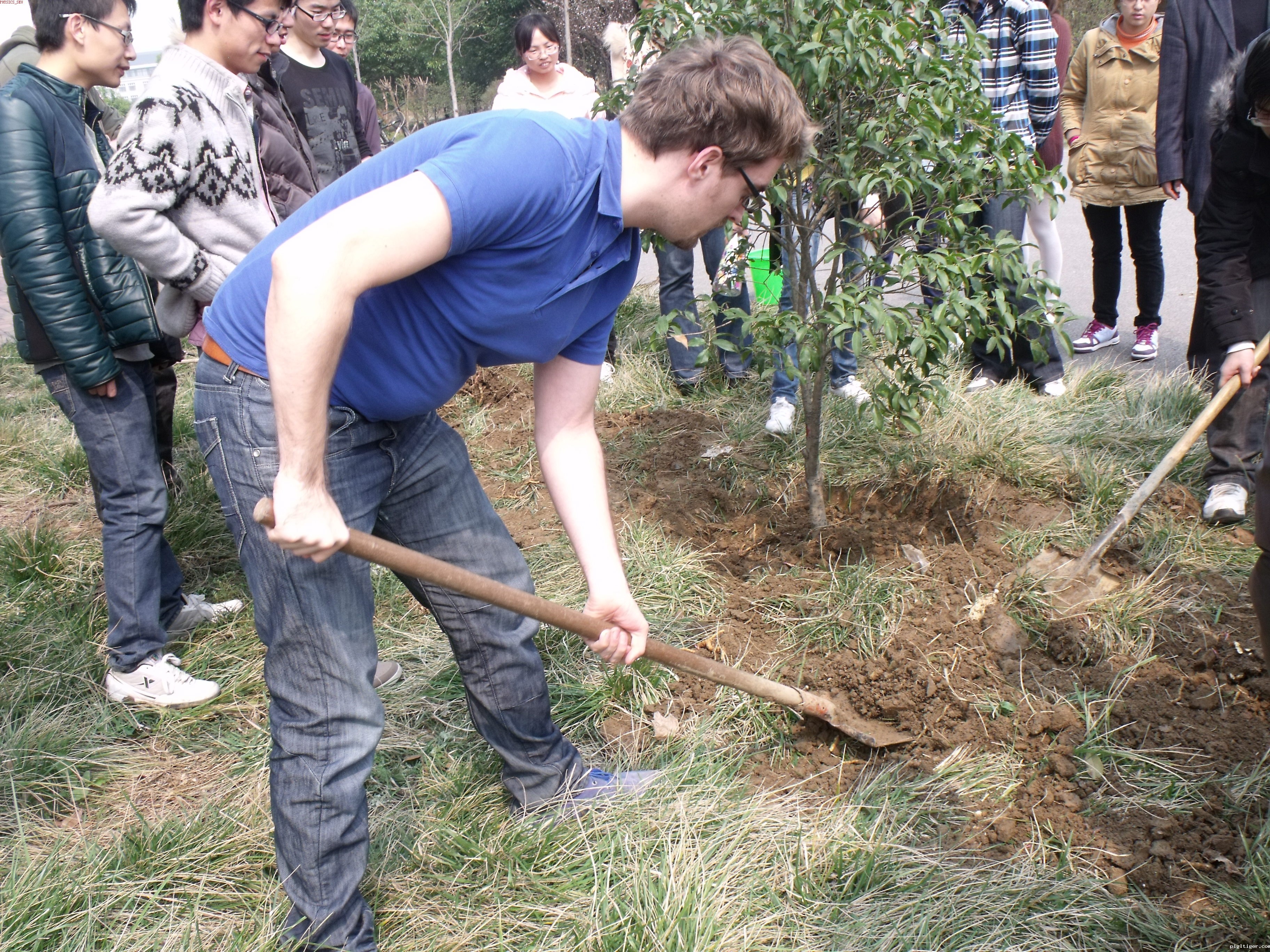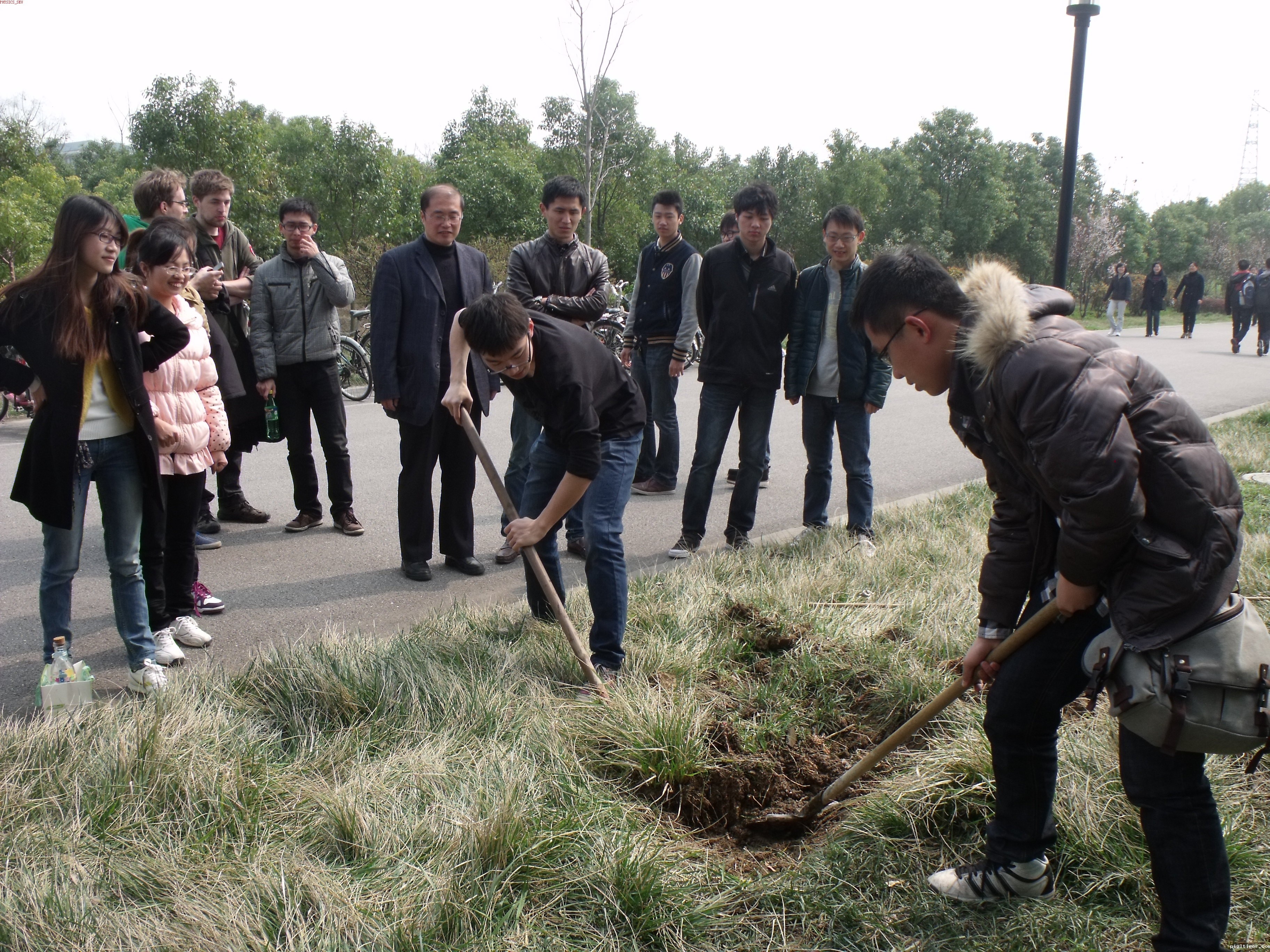 光信息科学与技术班班委们提前买来树苗、借来工具,并且放置好团旗和班旗,其他同学在十二点半在植树地点集合。选定地方后,男生们轮流用铁锹挖坑,女生浇水松土。经过半小时多的努力,终于挖出了直径半米左右,深三十多厘米的坑。然后由几位男生小心翼翼的将树放入坑内,填土、踩实,裴书记在旁热心提醒指挥。种完树后,光信息科学与技术班在树一米多远处埋下了包含全班愿望的许愿瓶。最后大家合影留念。