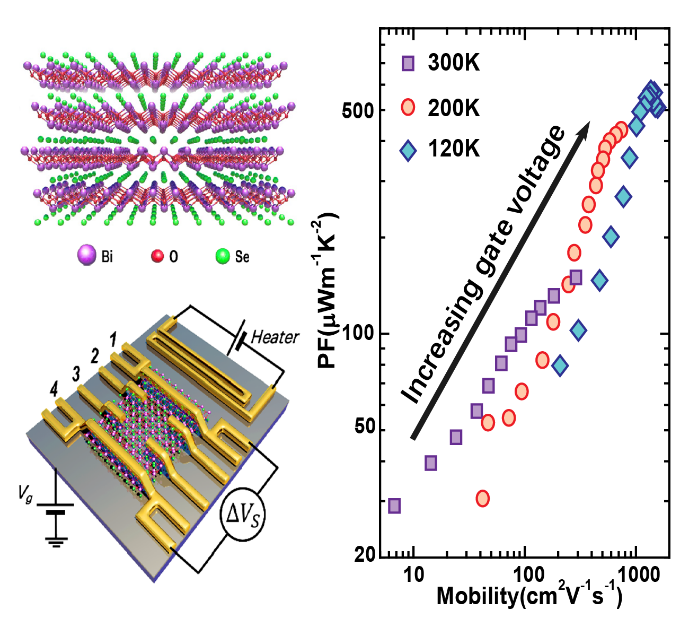 不同于目前广泛研究的石墨烯,过渡金属硫化物,黑磷等二维材料,二维Bi2O2Se的低声子群速度和强声子非谐散射使其具有极低的热导率(~0.92 W/mK APL 115, 193103 (2019)),同时兼具的高电子迁移率和良好的环境稳定性使得其在热电以及能源转化领域有着巨大的潜力。基于二维Bi2O2Se场效应晶体管的热电输运,二维Bi2O2Se载流子迁移率在高温下由极化光学声子散射主导,在低温下由压电散射主导。当压电散射主导时,其迁移率显著提高。同时电导率的急剧上升并没有导致塞贝克系数的明显下降,表明散射机制的调控可以实现电导率和塞贝克系数的去耦合。这与之前通过调控载流子浓度来平衡电导率和塞贝克系数的策略完全不同。同时,这种散射机制的转变温度具有高度的门电压可调性,通过施加一定大小的门电压,可以显著提高极化光学声子散射到压电散射的转变温度。热电功率因子与迁移率在两个数量级的调制上展现出近似线性的相关性,最终实现宽温度范围(80-200K)的高热电功率因子(>400mW-1m-1K-2)。