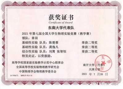 7月18至21日,第七届全国大学生物理实验竞赛(教学赛)在南开大学和天津大学两个赛区同时举行。物理学院章羽老师率必威betway官方入口学生代表队参赛,并勇创佳绩。其中19级张智恒和20级刘霄同学获得综合性实验竞赛二等奖,20级陈楚蓉同学和龚逸凡同学分获基础性实验项目A组和B组二等奖,必威betway官方入口获得优秀组织奖,这也是我校参加此项比赛以来取得的历史最佳成绩!
