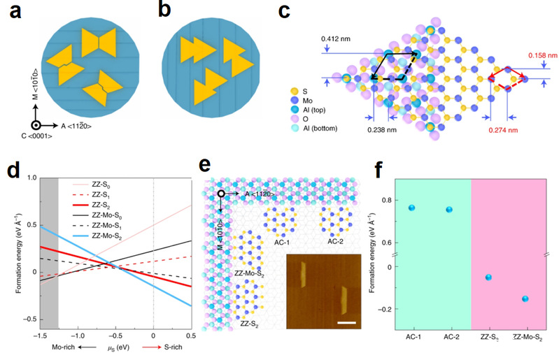 通过表面重构技术(如构造台阶面等)来降低衬底对称性有望解决这一问题。然而本工作的实验合作者发现,对对蓝宝石c面进行指向M轴(C/M)的斜切得到的台阶面上则生长出的依然是180°反平行的MoS2晶畴,并伴随有大量晶界(示意图a);而蓝宝石c面进行指向A轴(C/A)的斜切得到的台阶面上可以生长出99.6%单一取向的MoS2晶畴,这些取向一致的晶畴可以合并成大面积MoS2单晶薄膜(示意图b)。但是蓝宝石c面不同斜切方式对MoS2生长行为的影响机制并不清楚!