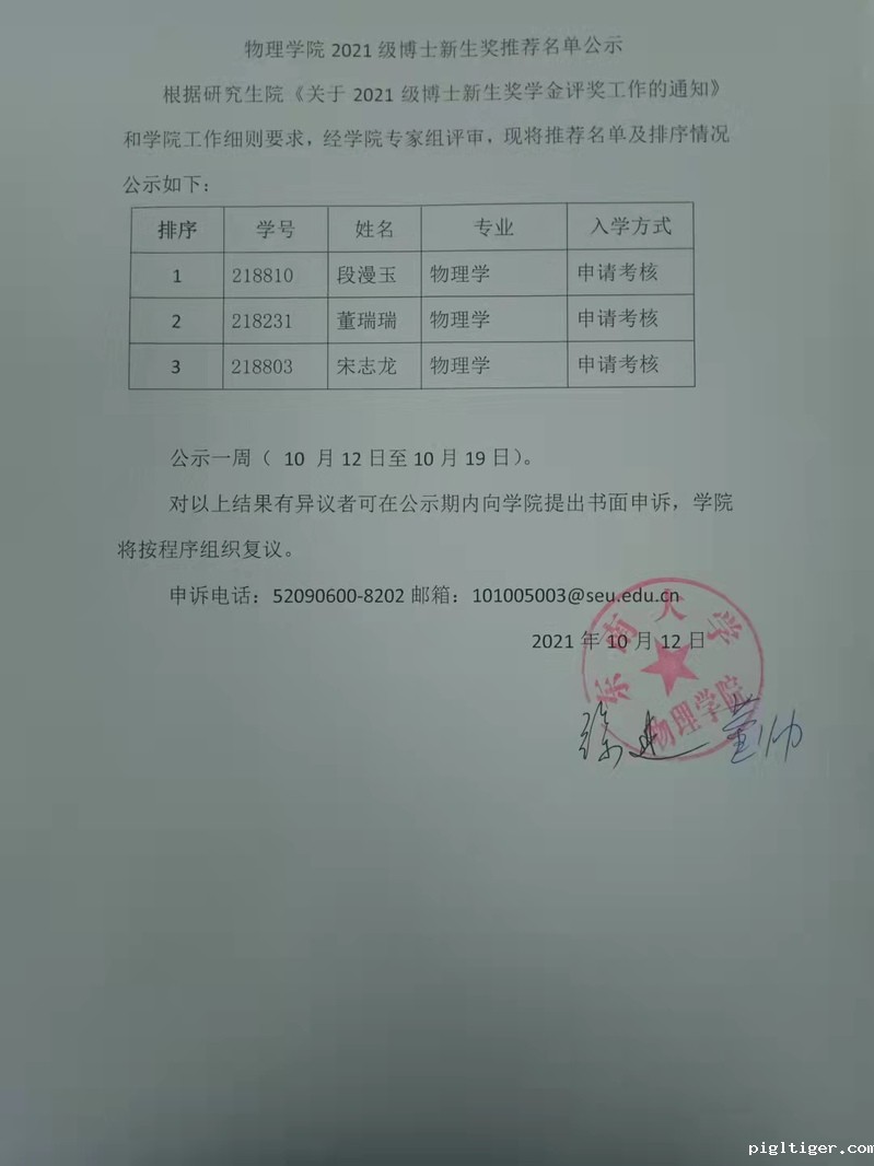 物理学院2021级博士新生奖推荐名单公示