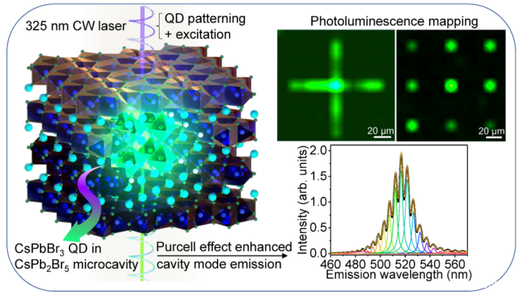 具有共振发光的全介电微结构在紧凑型非相干和相干光发射器件领域有重要应用,它们通常由传统半导体如硅和砷化镓等构成,其应用受到制造方法和发光可调性等因素的制约。金属卤化物钙钛矿具有优异的光电性能,存在较大的组分和光谱自由度。betway网站多少范吉阳教授课题组利用激光在CsPb2Br5微米片内部原位诱导产生具有多纵模自发辐射的CsPbBr3量子点。根据费米黄金法则,激光诱导产生的量子点的腔模自发辐射跃迁几率被提高两个数量级。同时,存在超线性的激发功率依赖关系并且其指数远大于自由空间激子自发辐射指数,表明在较高光子浓度下腔内同时存在受激辐射。这种全钙钛矿功能结构有望在信息技术和低阈值相干光器件中得到应用。