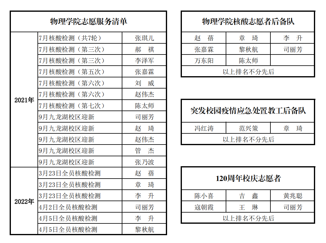 根据学校《关于表彰2021年度春晖教工志愿服务优秀分队和优秀志愿者的决定》(东大委机〔2022 〕3号),为展示我校春晖教工志愿者风采,营造良好的志愿服务氛围,进一步弘扬志愿服务精神,经机关党委会研究,决定和党委教师工作部联合对春晖教工志愿服务优秀分队和先进个人予以表彰,物理学院党委被评为“2021年度春晖教工志愿服务优秀分队”。