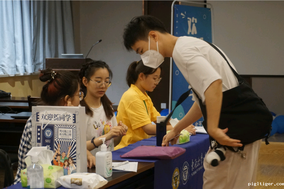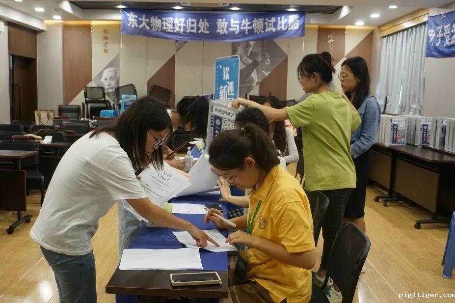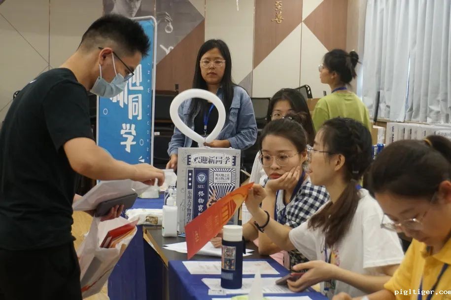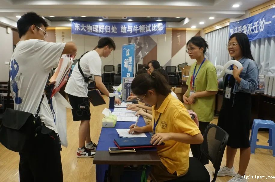 与此同时,学院老师和研会成员也在物理学院迎新点等待着新生们的报到,收取报到资料、悉心为他们讲解新生注意事项、分发专属礼包并为其拍照留念...