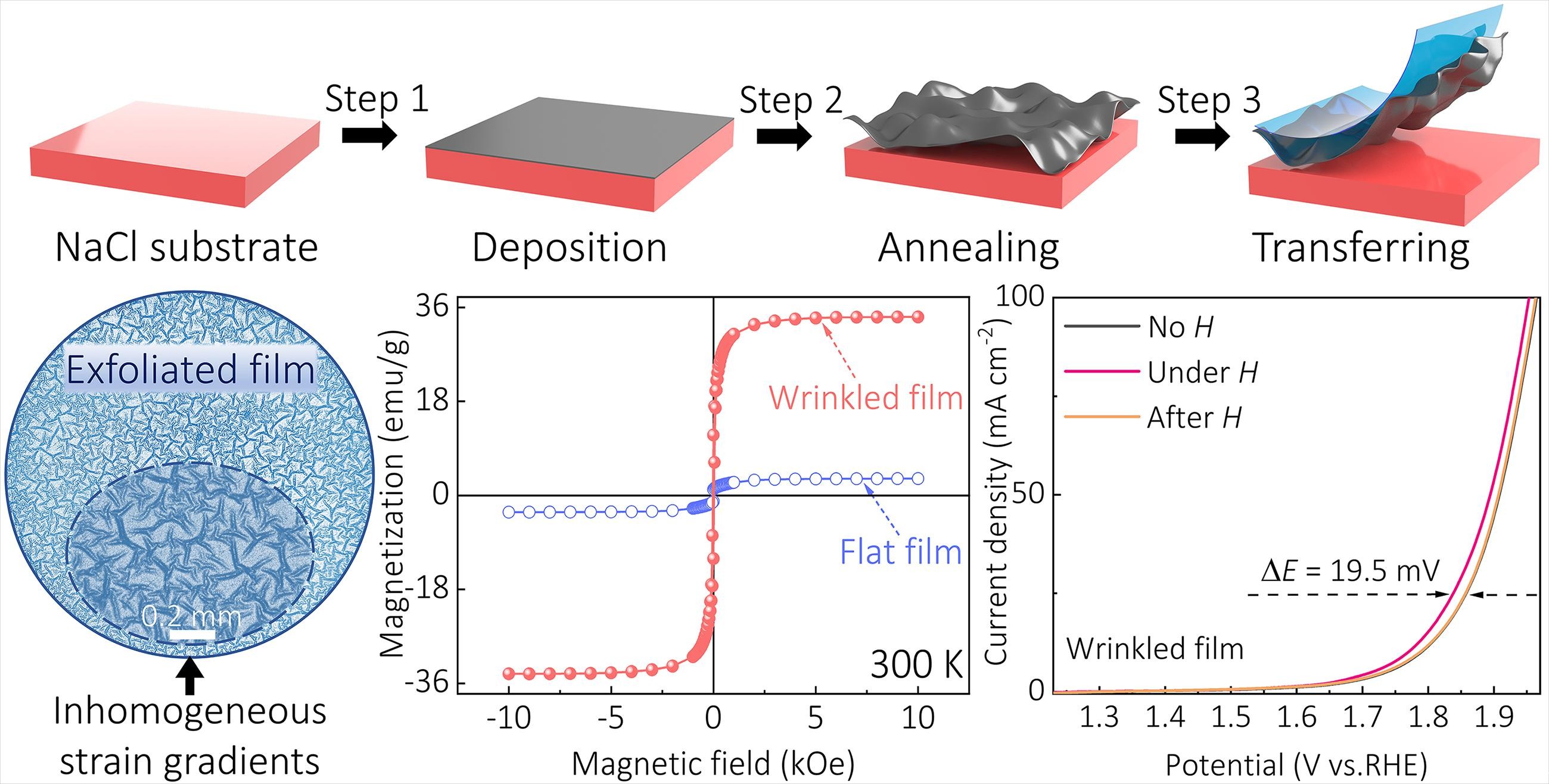 功能材料的自支撑薄膜可通过应变和应变梯度调控特性,从而拓宽其应用领域。必威betway官方入口徐庆宇教授和范奇副教授合作提出一种系统的方法,利用NaCl衬底的膨胀收缩和界面的弱范德华相互作用,通过脉冲激光沉积制备自支撑CrMnFeCoNi高熵合金薄膜,当薄膜转移至粘性手柄时会形成具有非均匀应变梯度的褶皱。团队证明非均匀梯度的外部应变(挠曲磁效应)可以诱导褶皱高熵合金薄膜中从FCC到BCC的部分结构相变,使其室温饱和磁化强度相比于无应变的平整高熵合金薄膜提高十倍。此外,在施加外部磁场后,由于褶皱和平整高熵合金薄膜中电子散射引起的电子转移行为不同,它们的磁电化学响应呈现出截然相反的图景。该工作为通过复杂的应变几何结构调控物理和化学特性提供了一种前景广阔的策略。