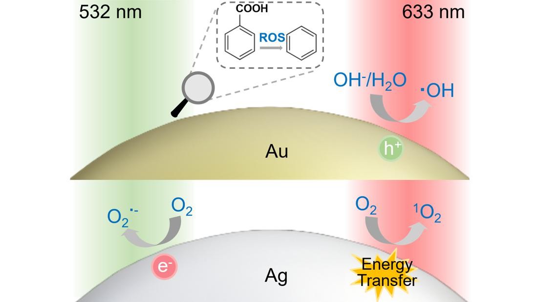 团队基于液相表面增强拉曼光谱方法,对等离激元诱导反应的氧化机制进行了研究。表面等离激元衰变产生的热载流子具有极高的能量,可以诱导化学键的断裂或形成,是驱动高活化能化学反应的可行策略。一种普遍的解释表明,具有还原性的热电子和具有氧化性的热空穴直接转移到反应物分子上,触发反应物分子的氧化还原反应。尽管这一理论在解释等离激元诱导的还原反应时屡试不爽,但在解释相关氧化过程时遇到了挑战。例如,银表面趋向于生成还原性的热电子,这无法解释银高效诱导的氧化反应;另外多个课题组发现了催化效率在非耦合激光下的显著提升,由于缺乏理论支撑,这种现象经常被归咎于纳米颗粒的聚合效应。