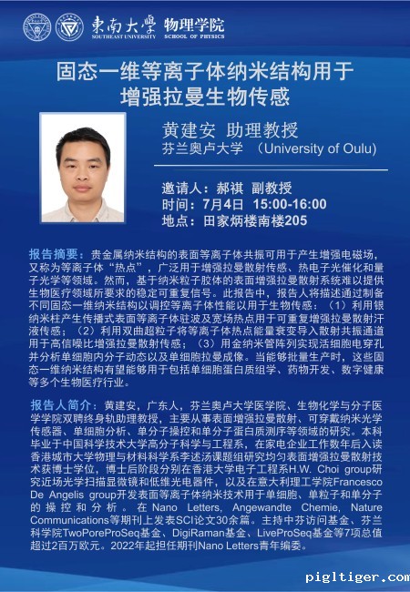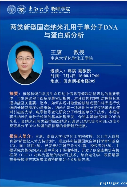 7月4日周四15:00学术报告|1.固态一维等离子体纳米结构用于增强拉曼生物传感2.两类新型固态纳米孔用于单分子DNA与蛋白质分析