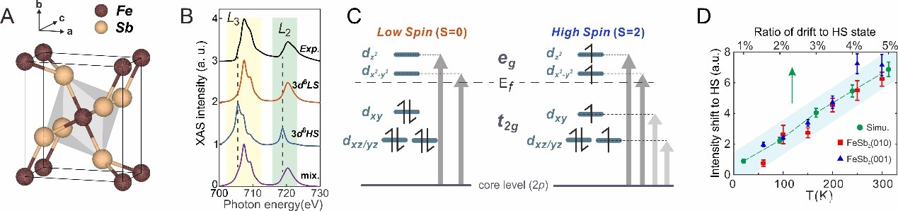 图. A. FeSb2晶体结构。B. FeSb2L边X射线吸收谱实验及模拟结果。C. FeSb2中不同自旋态下轨道占据示意图。D.实验及模拟结果中发现的低自旋态向高自旋态转移的直接证据。