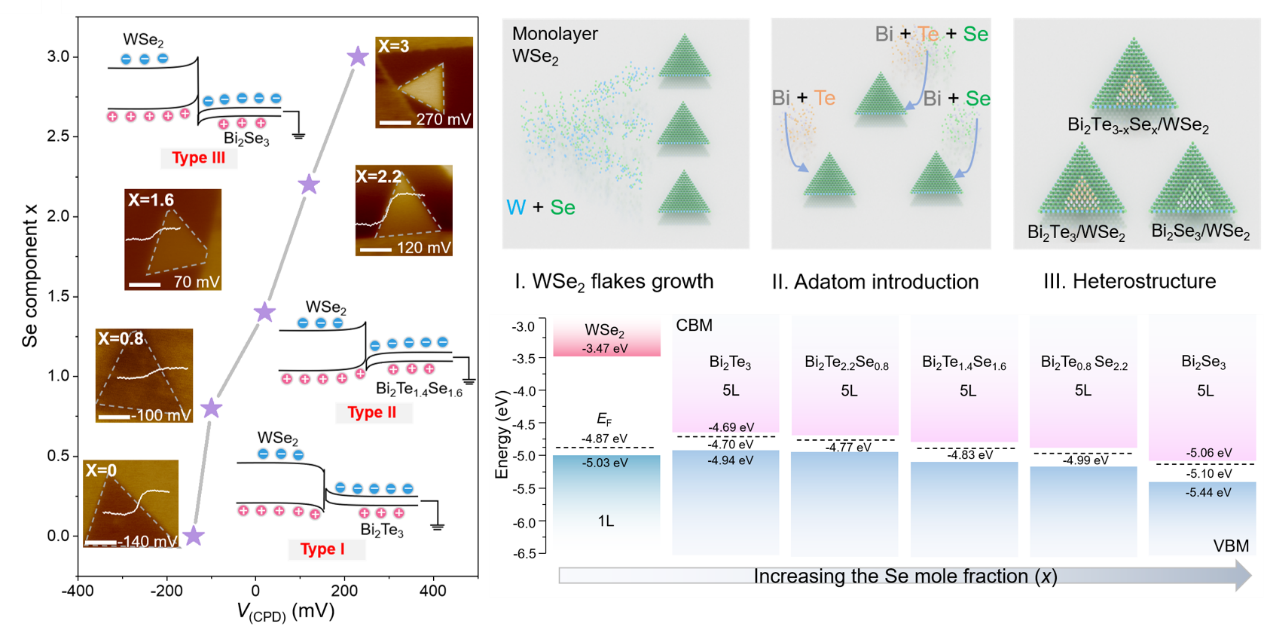 近日,必威betway官方入口倪振华教授、吕俊鹏教授课题组和中国科学院半导体研究所魏钟鸣研究员课题组合作提出了利用原子取代构建渐变能带结构的新策略,在WSe2/Bi2Te3-xSex范德华异质结(vdWHs)中,实现了I型到III型的精准能带匹配,获得了高效的异质界面电荷转移,构筑了高性能光电器件。相关成果以《二维范德华异质结中组分可调的I型到III型能带对准工程》“Composition Modulation-Mediated Band Alignment Engineering from Type I to Type III in Two-dimensional vdW Heterostructures”为题发表在Advanced Materials上。