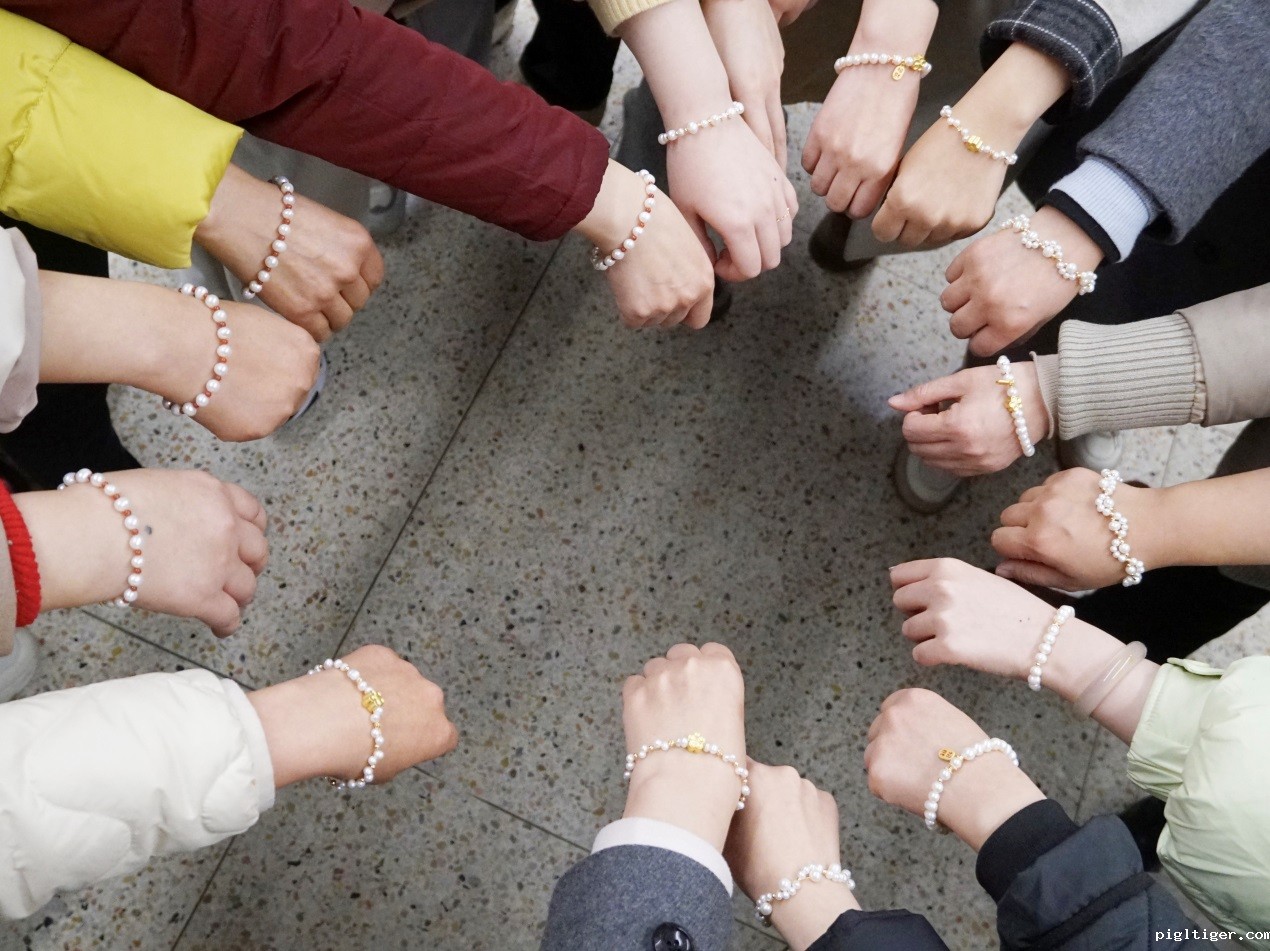 “平时忙于科研和教学,很少有机会静下心来体验手工的治愈感。看到亲手制作的手链在阳光下闪耀,仿佛也提醒自己要像这些珠子一样,既保持独立的美丽,又能与团队紧密相连。”老师们捧着自己制作的手链感慨道。活动尾声,大家纷纷佩戴作品合影留念,手链上跃动的光影与笑脸交相辉映,成为节日最动人的注解。