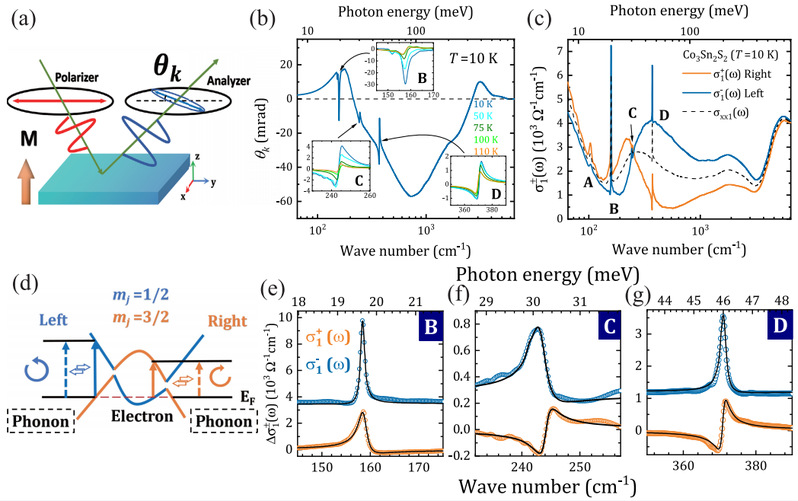 图2:Co3Sn2S2中红外活性的Eu模式声子,在两个圆偏振通道中不同程度的电声子耦合导致了声子的圆二色性。(a)极性Kerr旋转测量的示意图,其中光与磁矩平行但垂直于样品表面。(b)在10 K温度下测量的低于0.8 eV的Kerr旋转角光谱。插图显示了在不同温度T下测量的声子B、C和D的Kerr旋转光谱,其中电子背景被减去。(c) Co3Sn2S2在10 K下的圆偏振光学电导率σ±⊥(ω)。四个红外活性声子用大写字母标记。虚线表示非偏振光学电导率σxx1(ω) = 1/2[σ+⊥(ω) + σ−⊥(ω)]。(d)每种圆偏振下的EPC示意图,其中构成Weyl节点环的能带具有不同的角动量+3/2(橙色)和+1/2(蓝色),分别表示。实线和虚线表示声子和电子的直接带间跃迁。(e)–(g)在10 K下每种圆偏振下声子B、C和D的线形。黑色实线是Fano模型的拟合。