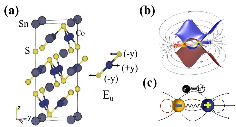 图1:(a)磁性外尔半金属Co3Sn2S2的晶格结构和其中红外活性的Eu模式振动。(b)Co3Sn2S2中的拓扑能带。(c)电声子耦合示意图。