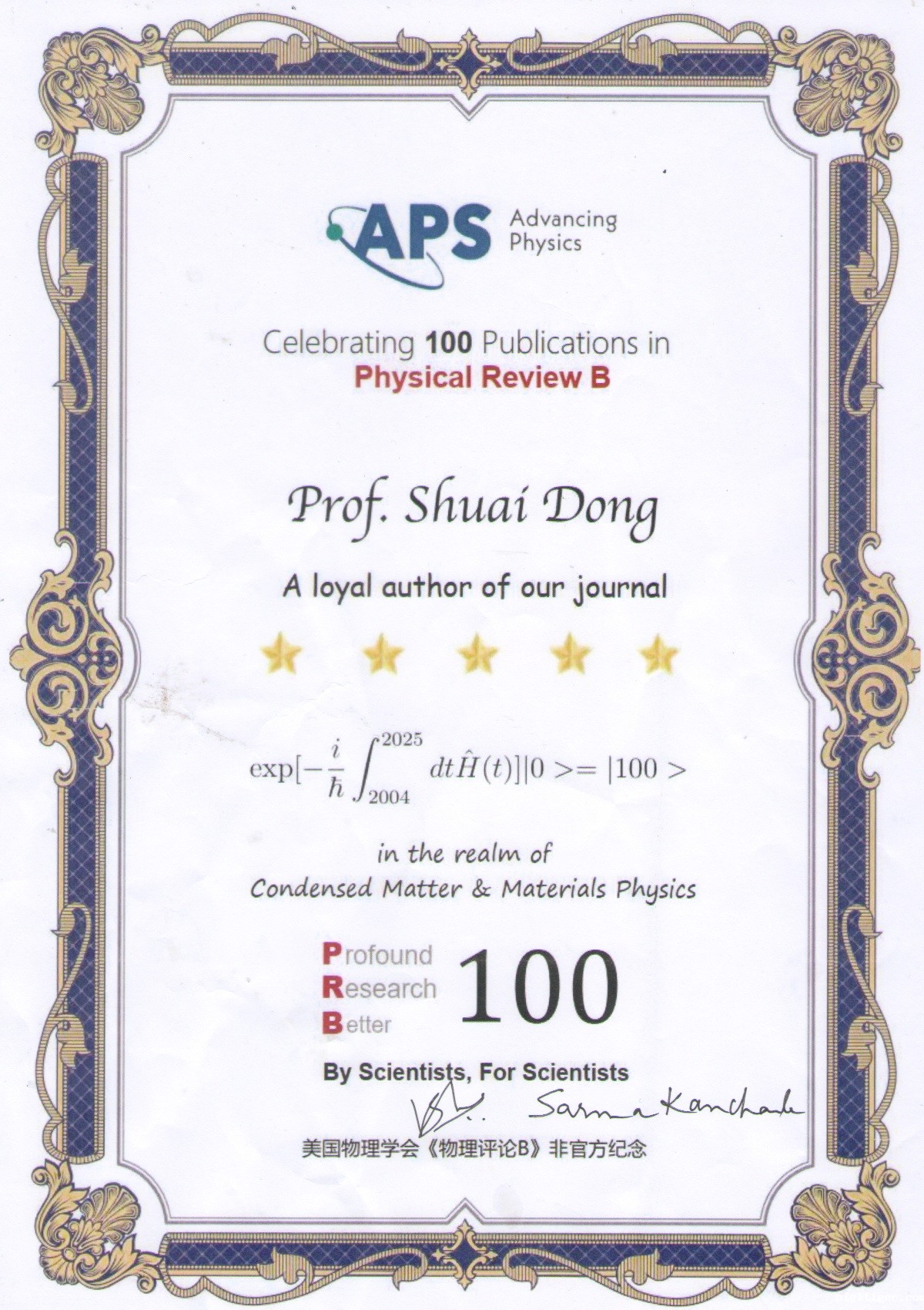 8.5 | 周颖与合作者在美国物理学会(APS)期刊Physical Review B发表题为Out-of-plane ferroelectricity, magnetoelectric coupling, and persistent spin texture in two-dimensional multiferroics的论文。经历11年的努力,董帅在美国物理学会(APS)期刊Physical Review B累计发文100篇。 由PRB主编Sarma Kancharla博士签名的奖状: ![]() |