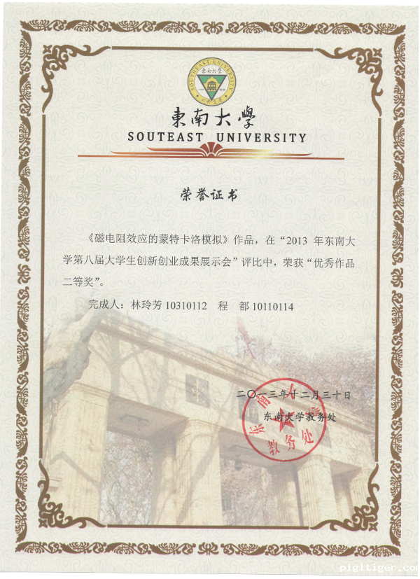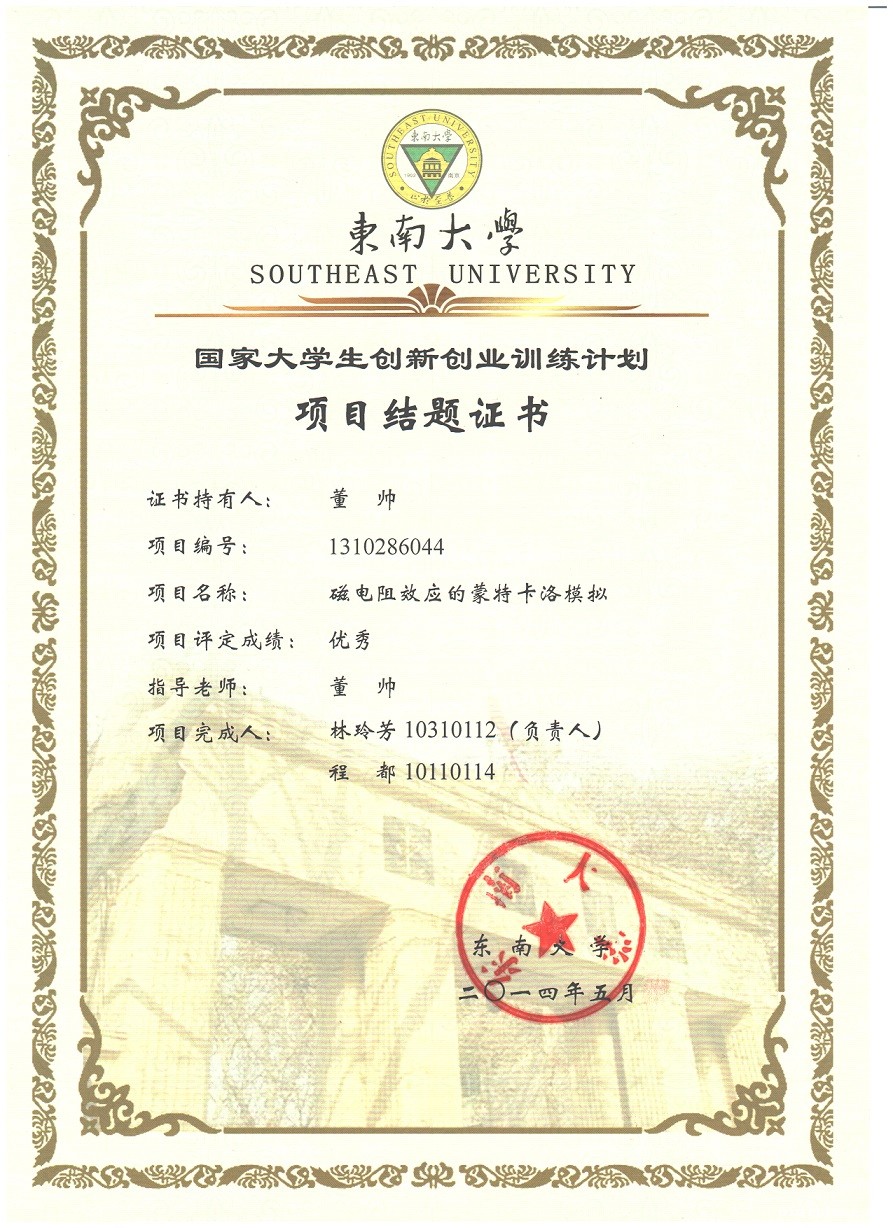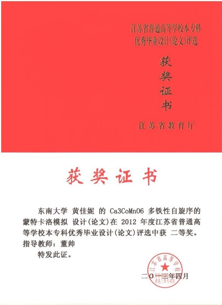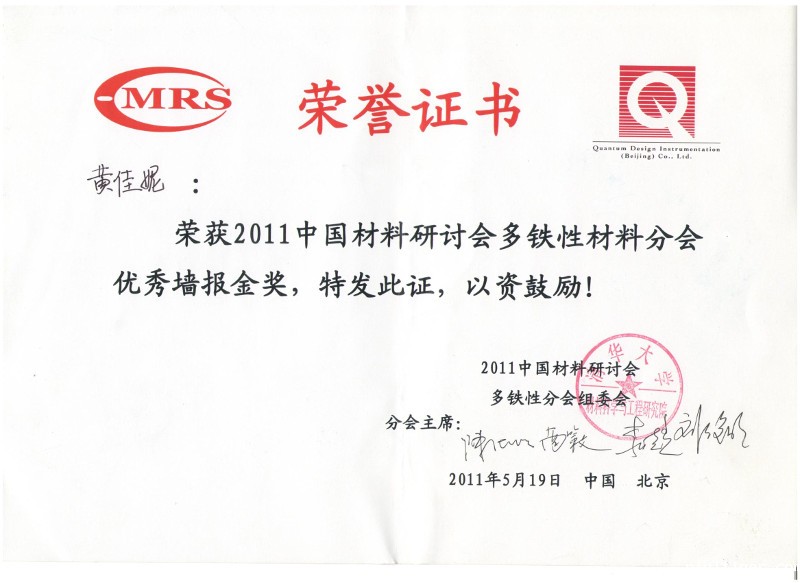 2010-2012 | 国家级,1项 | 2011年必威betway官方入口第六届大学生科技创新成果展示会二等奖 2011中国材料研讨会(C-MRS)获“多铁性材料分会”优秀海报金奖 结题成绩优秀 |