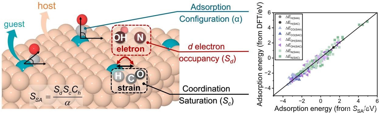 针对这一问题,团队通过高通量计算与物理化学分析,提出“单原子饱和度(SSA)”模型,从电子结构与几何结构双重维度构建了普适性描述符。SSA综合考虑了单原子活性位点的d电子占据饱和度(Sd)、配位饱和度(Sc)、主体原子类型(Ch)以及中间体吸附构型(α)四大关键因素,成功量化了不同反应中关键中间体(如*CO、*OH、*H、*N)的结合强度。基于该模型,团队预测了多个高效催化剂体系,结果与已报道实验数据高度吻合。此外,单原子饱和度更可拓展应用于非金属载体负载的单原子催化剂表面,展现出很强的普适性。该工作揭示了单原子位点催化剂在多种化学反应中的构效关系,为单原子位点催化剂理性设计提供了基本准则。