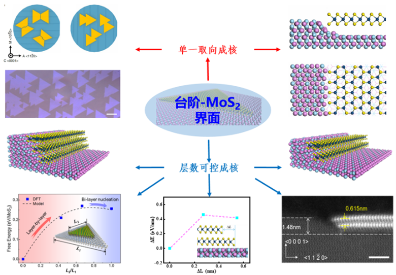 MoS2为代表的过渡金属硫化物(TMDs)二维材料,是一类具有高载流子迁移率和高开关比的直接带隙半导体,并兼具良好的力学特性和光电性能,被视为后硅基半导体时代继续延续摩尔定律的理想候选材料之一。但目前MoS2的气相化学沉积法(chemical vapor deposition, CVD)外延生长普遍面临着单晶面积小、晶界密度高和产率低等诸多难点。此外,二维材料的性质具有层数(厚度)依赖的特点,然而生长中的层数控制也是困扰已久的一个实验难题。课题组基于先进的多尺度模拟方法,在二维材料的成核与生长机理的理论研究方面取得重要进展,提出了单取向成核机制以及层数可控生长机制并得到了实验验证。相关成果发表在Nature, Nature Nanotechnology,  Advanced Materials